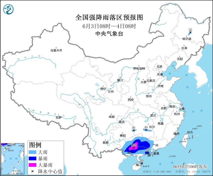 中央气象台6月3日06时继续发布暴雨蓝色预警:预计,6月3日08时至4日08时,广西大部、广东中西部、湖南南部等地部分地区有大雨到暴雨,其中,广西中部等地部分地区有大暴雨(100~180毫米)。上述部分地区伴有短时强降水(最大小时降雨量20~50毫米,局地可超过70毫米),局地有雷暴大风等强对流天气。