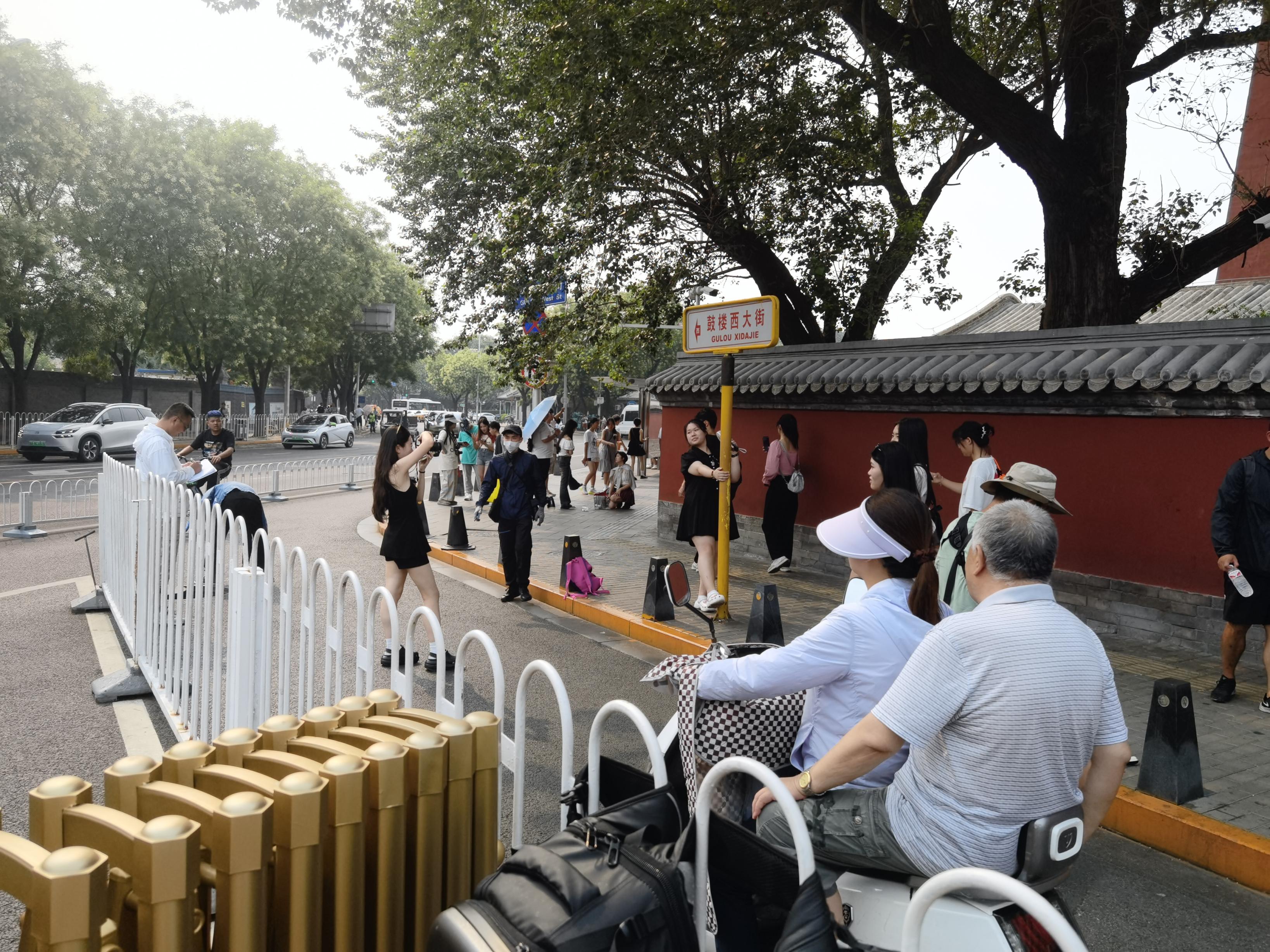 而在一天之前,这里的交通乱象还让过往行人大为头疼。电视剧《玫瑰的故事》热播后,鼓楼作为拍照打卡地更热闹了,部分游客为了拍到好看的鼓楼同框照,在人行道和非机动车道之间来回走动,或弯腰或蹲着摆pose,与非机动车流擦身而过,看起来十分危险。每天早晚高峰时段,鼓楼南门前电动车、自行车的滴滴摇铃声不绝于耳,给骑行人和附近居民带来不少困扰。