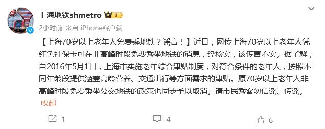 @上海地铁shmetro 表示,据了解,自2016年5月1日起,上海市实施老年综合津贴制度,对符合条件的老年人,按照不同年龄段提供涵盖高龄营养、交通出行等方面需求的津贴。原70岁以上老年人非高峰时段免费乘坐公交地铁的政策也同步予以取消。请市民乘客勿信谣、传谣。