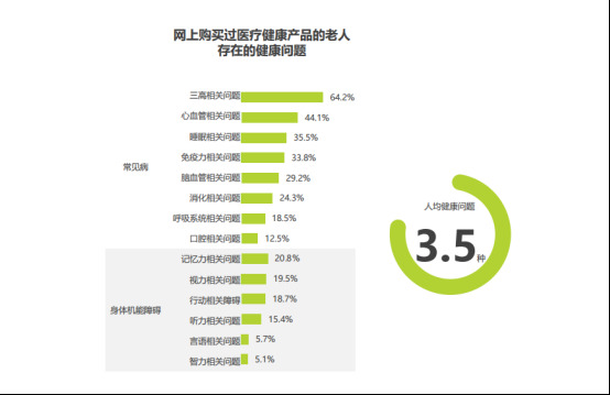 报告显示,目前网购医疗健康产品的老年人占比逐渐提高,有71.2%的老年人在网上购买过医疗健康产品。这些老年人普遍学历较高,高线和低线城市均有一定比例渗透,大多采取居家养老方式。他们遇到的主要健康问题为三高、心血管等慢性疾病,且面临多病共发的挑战。