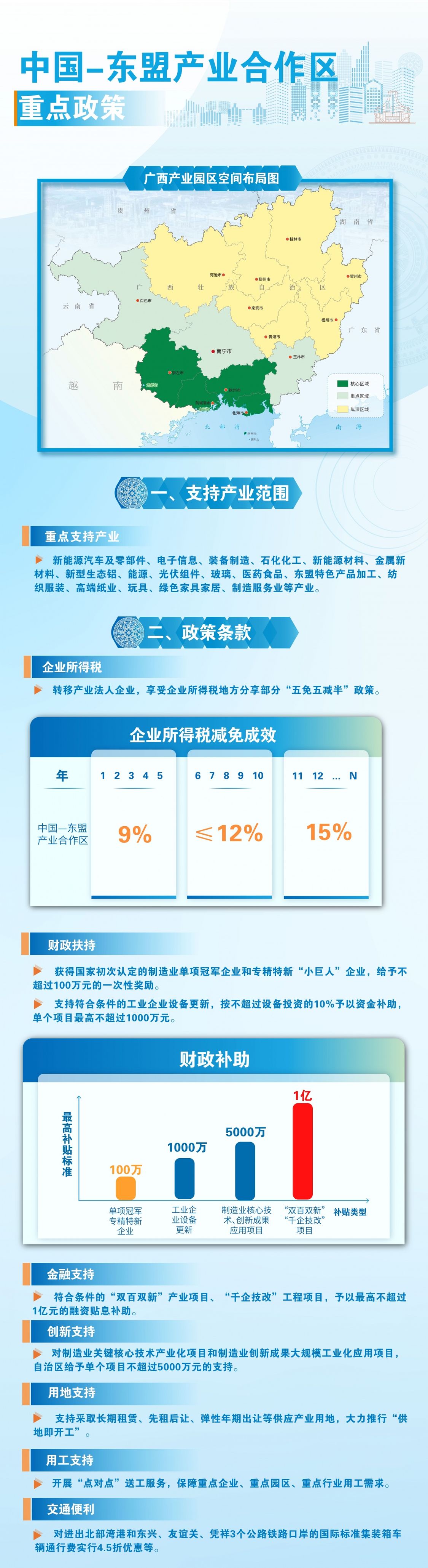 作为中国—东盟产业合作区的组成部分,百色片区与南宁、北海、防城港、钦州、玉林、崇左片区一起有着“专属”的招商福利——除了能为入驻当地园区的企业提供企业所得税优惠政策,还能在金融、创新、用地、用工方面提供各种支持,为企业节省一大笔开支。
