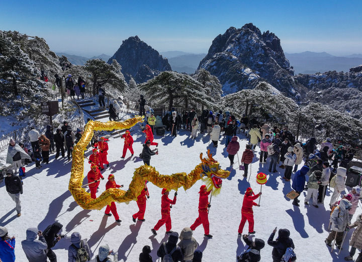 2025年1月27日,民俗舞龙队在雪后的安徽省黄山风景区光明顶表演(无人机照片)。新华社发(施亚磊摄)