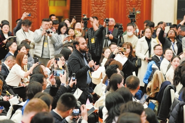 3月3日,全国政协十四届三次会议新闻发布会在北京人民大会堂举行,巴西劳动者电视台记者在发布会上提问。新华社 发