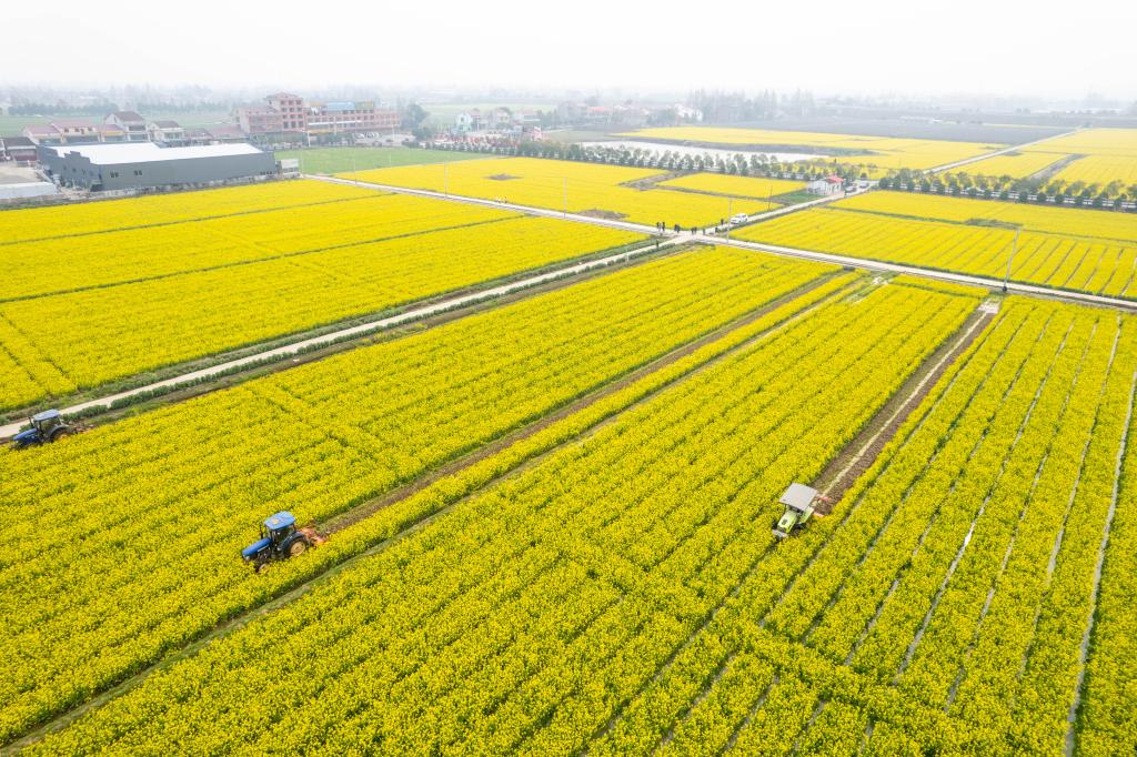 近日,在湖南省沅江市草尾镇乐园村,村民操作旋耕机翻耕芥兰绿肥(无人机照片)。新华社记者陈思汗 摄
