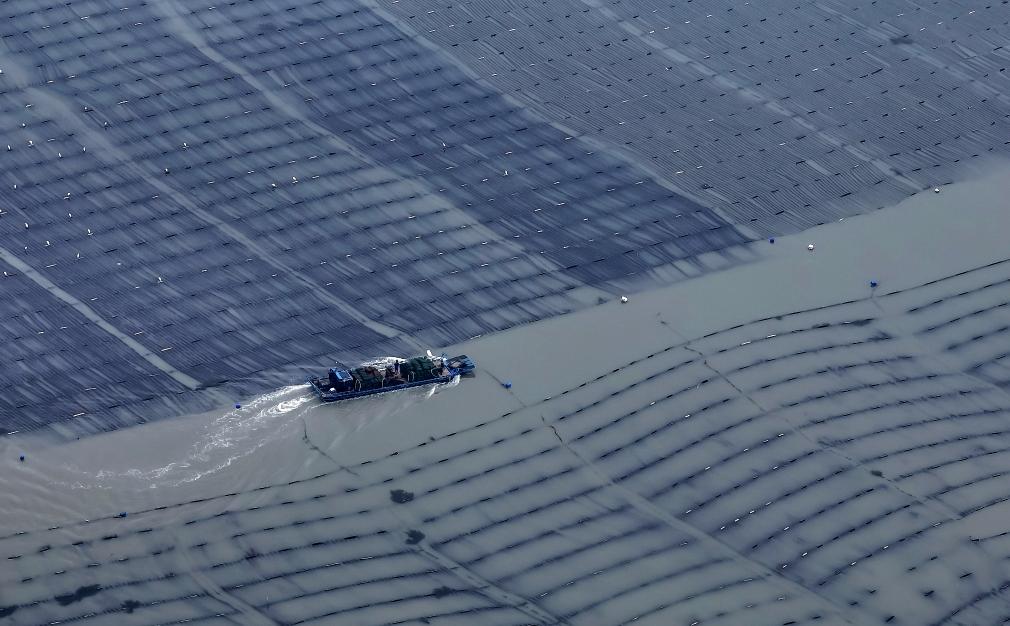 近日,一艘海上养殖作业船穿行在莆田南日岛海域的龙须菜养殖区(无人机照片)。新华社记者魏培全 摄