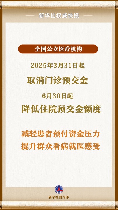 国家卫生健康委、财政部、国家医保局等6部门日前联合印发通知,要求全国公立医疗机构、医保定点医疗机构和军队主办的医疗卫生机构自2025年3月31日起取消门诊预交金,6月30日起降低住院预交金额度。