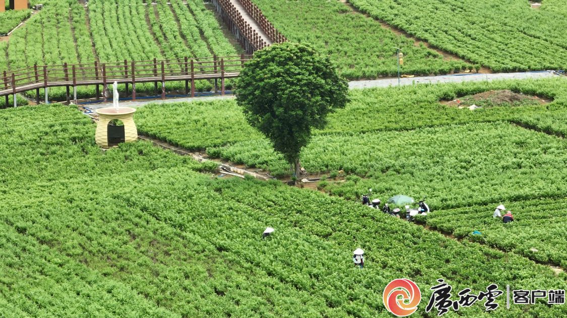 5月20日上午,在横州市校椅镇石井村中华茉莉园,连片的茉莉花田生机盎然,花朵洁白如雪,清香四溢。花农身挎竹篓,穿梭在花丛间,熟练地采摘着一朵朵饱满的茉莉花。