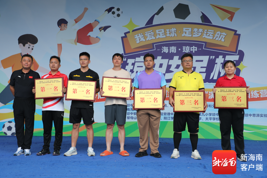 经历了32个激烈的比赛日后,琼中中学高二男3队获得高中男子组第一名、琼中中学高二女2队获得女子组第一名;获得初中男子组第一名的是琼中思源实验学校、获得初中女子组第一名的是琼中思源实验学校;海口市滨海第九小学琼中附属实验小学分别获得小学男子组、女子组第一名。现场为各组别获奖球队颁发奖杯及奖牌,为获得最佳射手奖、最佳守门员奖、优秀组织奖的选手及学校颁奖。