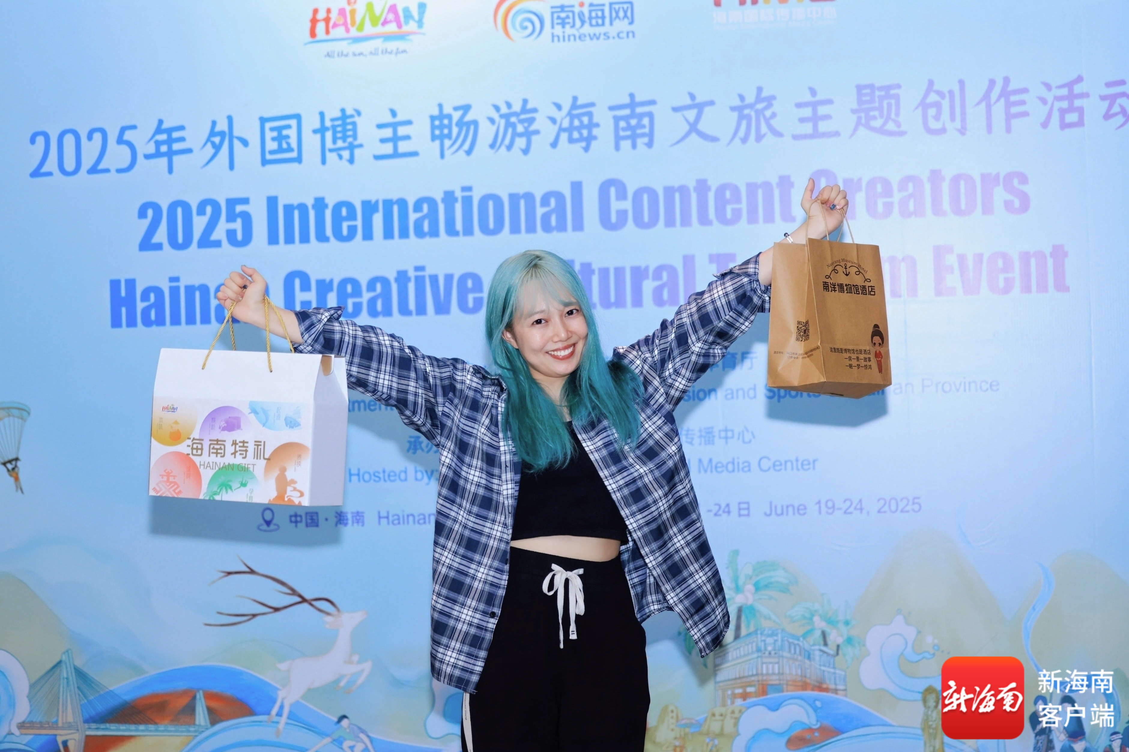 2025年外国博主畅游海南文旅主题创作活动报到日,日本博主知香在展板前合影。主办方供图