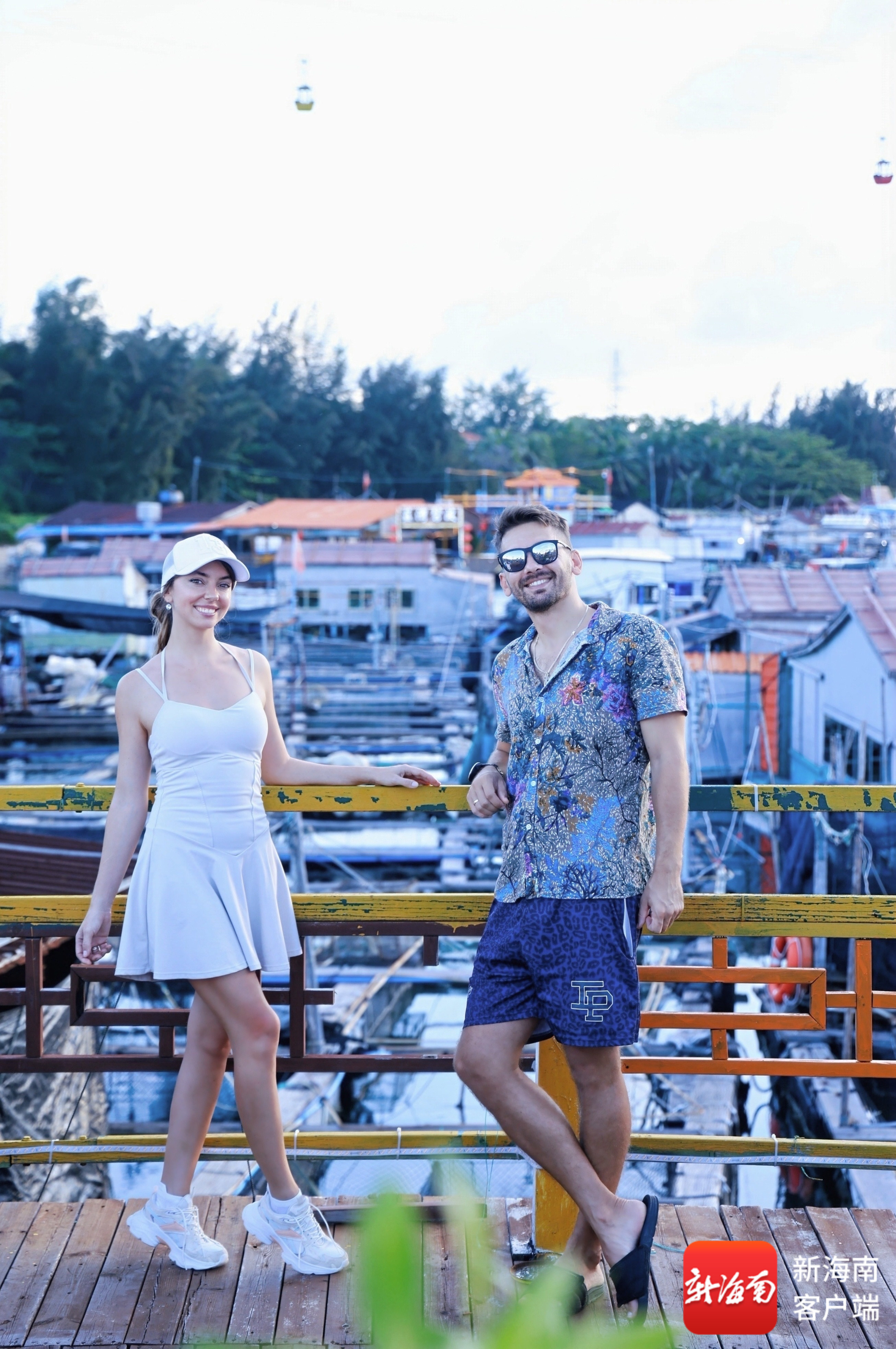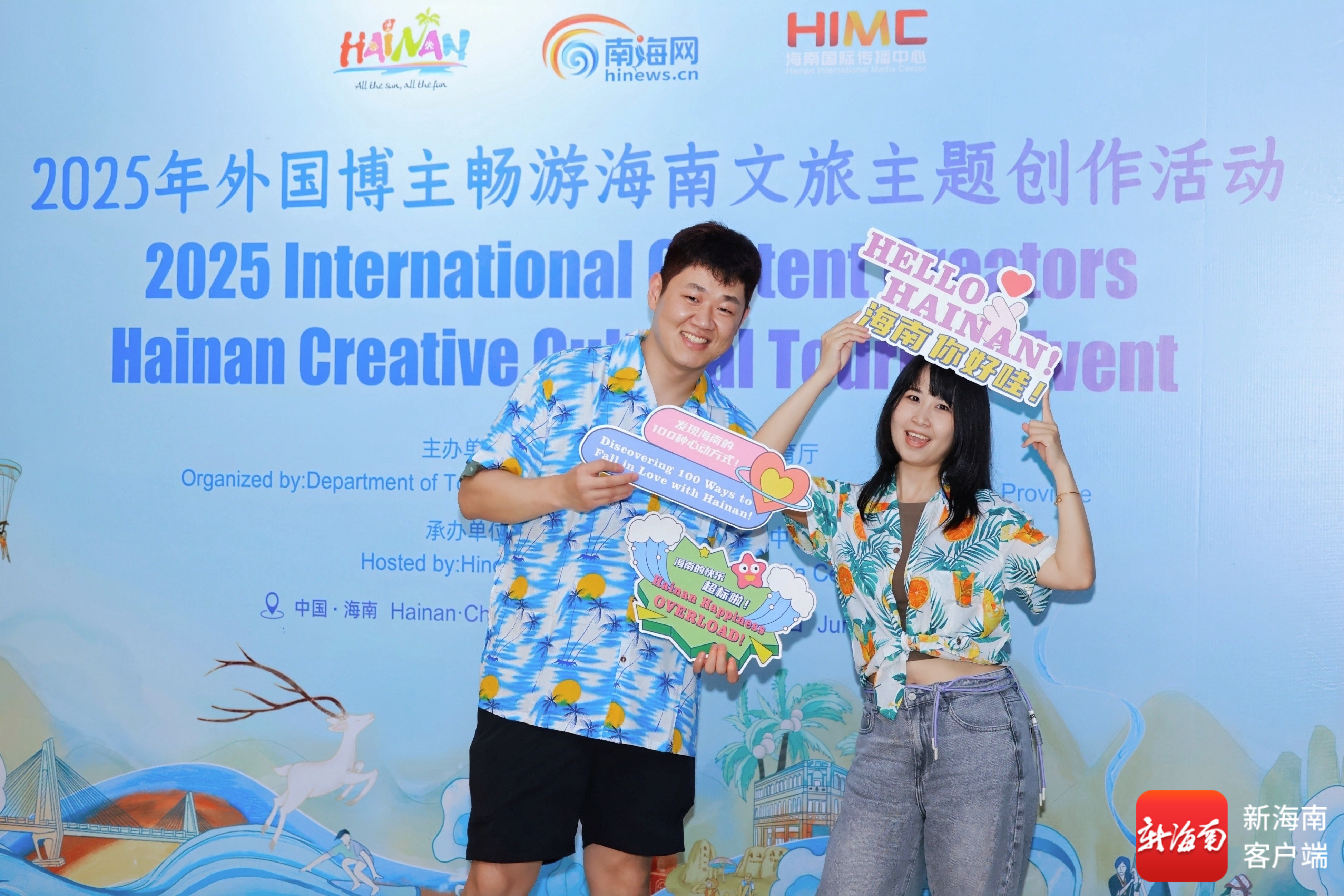 2025年外国博主畅游海南文旅主题创作活动报到日,马来西亚博主刘佑秀(右)和男友在展板前合影。主办方供图