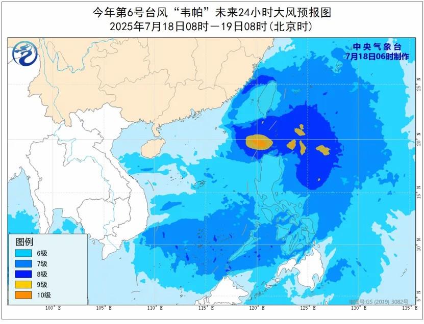 大风预报:7月18日08时至19日08时,受“韦帕”和西南季风的共同影响,南海大部、巴士海峡、台湾海峡、台湾以东洋面、东海南部将有6至7级大风、阵风8至9级,南海东北部偏东海域、巴士海峡、台湾海峡风力有8至9级,阵风10至11级,台风中心经过的附近海域风力有10级,阵风11至12级。