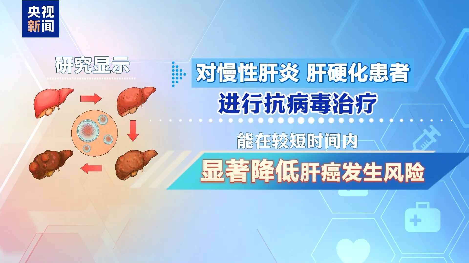 研究显示,慢性乙肝患者肝癌风险比常人高出15至20倍,对慢性肝炎、肝硬化患者进行抗病毒治疗能在较短时间内显著降低肝癌发生风险。肝脏纤维化患者接受规范抗病毒治疗3至5年,可降低罹患肝癌的风险10%至30%。