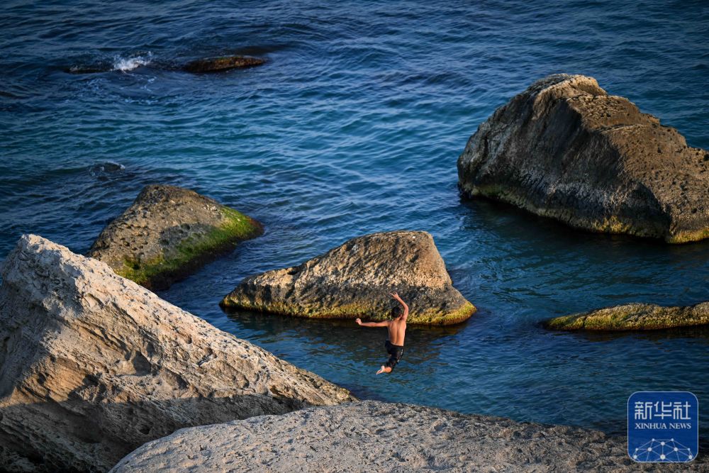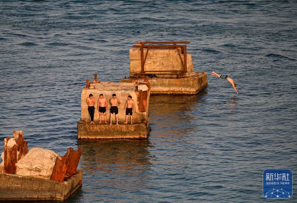 ↑8月5日,在哈萨克斯坦阿克套,一个男孩在里海海边纵身跳向大海。