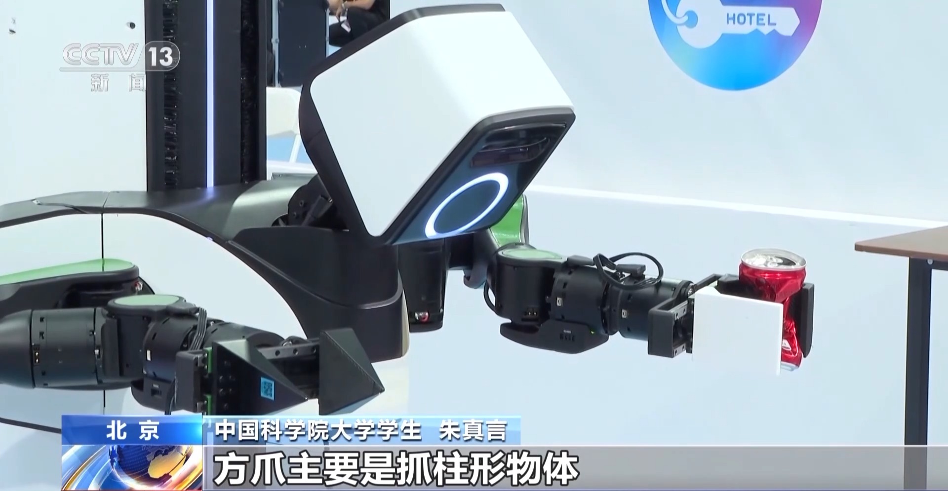 中国科学院大学学生 朱真言:方爪主要是抓柱形物体,比如说罐子和瓶子,尖爪主要为了减小夹爪的体积,这样可以更方便抓塑料袋和纸团之类的。