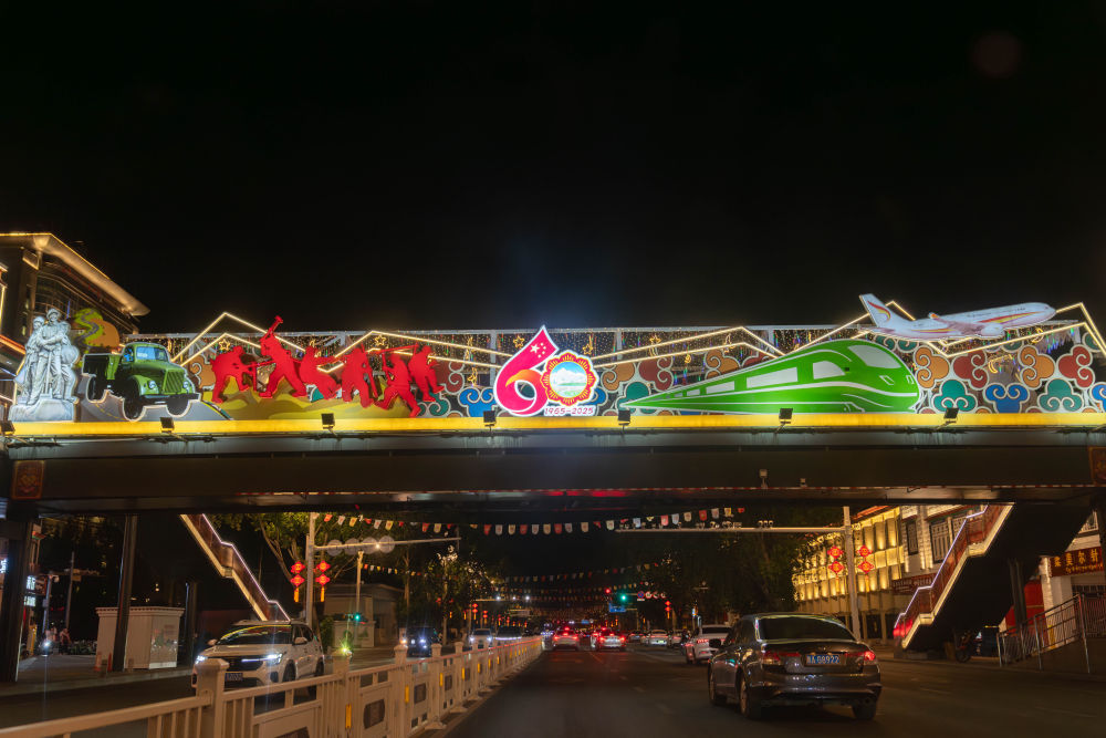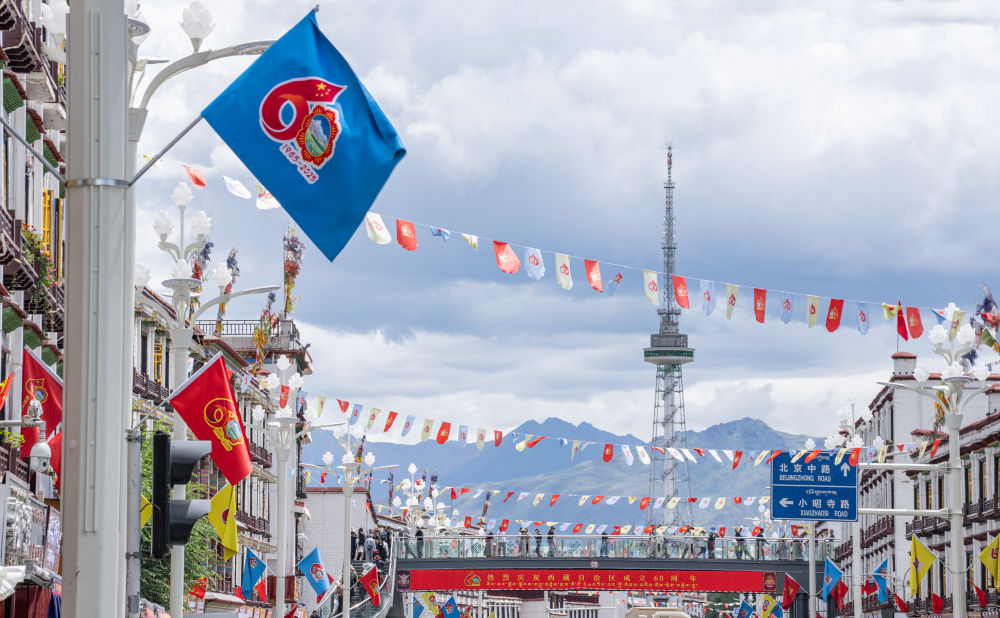 在庆祝西藏自治区成立60周年之际,拉萨街头张灯结彩,处处洋溢着喜庆氛围。