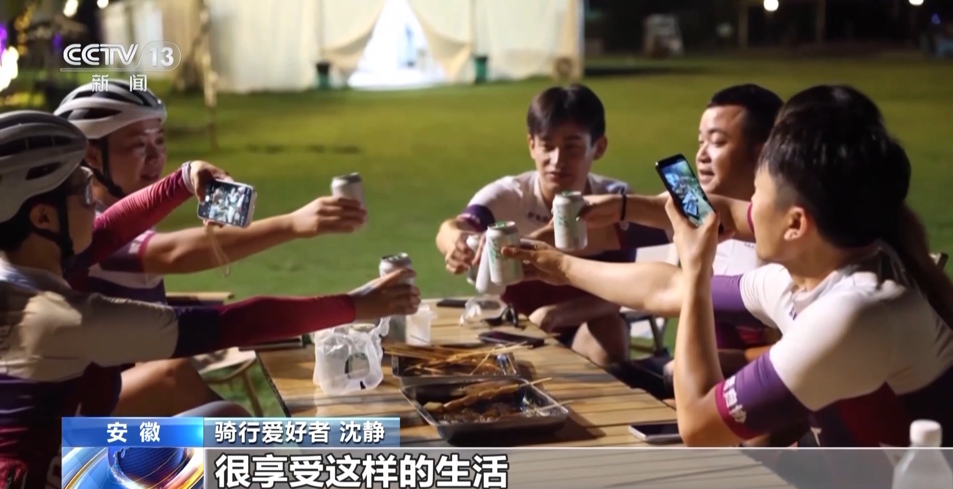 骑行爱好者 沈静:我们早上的时候就约好骑到露营地这边,因为晚上有一个烧烤,骑完刚好可以吃烧烤,很享受这样的生活。