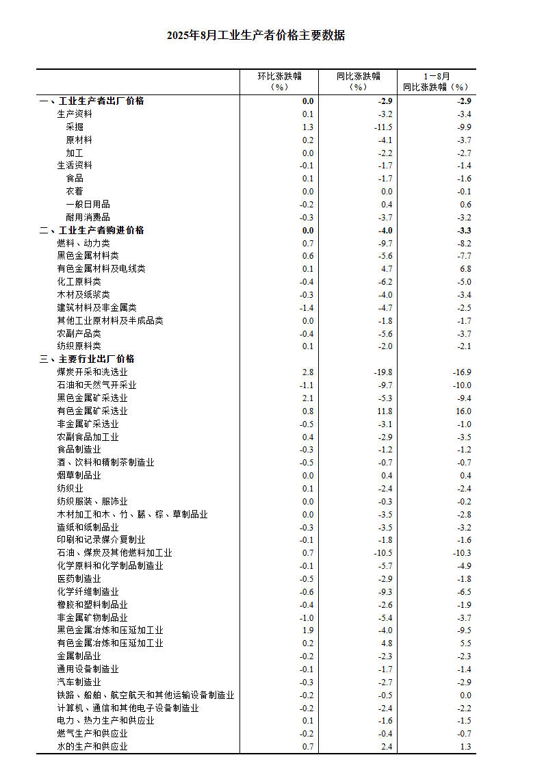 中新网9月10日电 据国家统计局网站消息,2025年8月份,全国工业生产者出厂价格同比下降2.9%,降幅比上月收窄0.7个百分点,环比由下降0.2%转为持平。工业生产者购进价格同比下降4.0%,环比持平。1—8月平均,工业生产者出厂价格比上年同期下降2.9%,工业生产者购进价格下降3.3%。