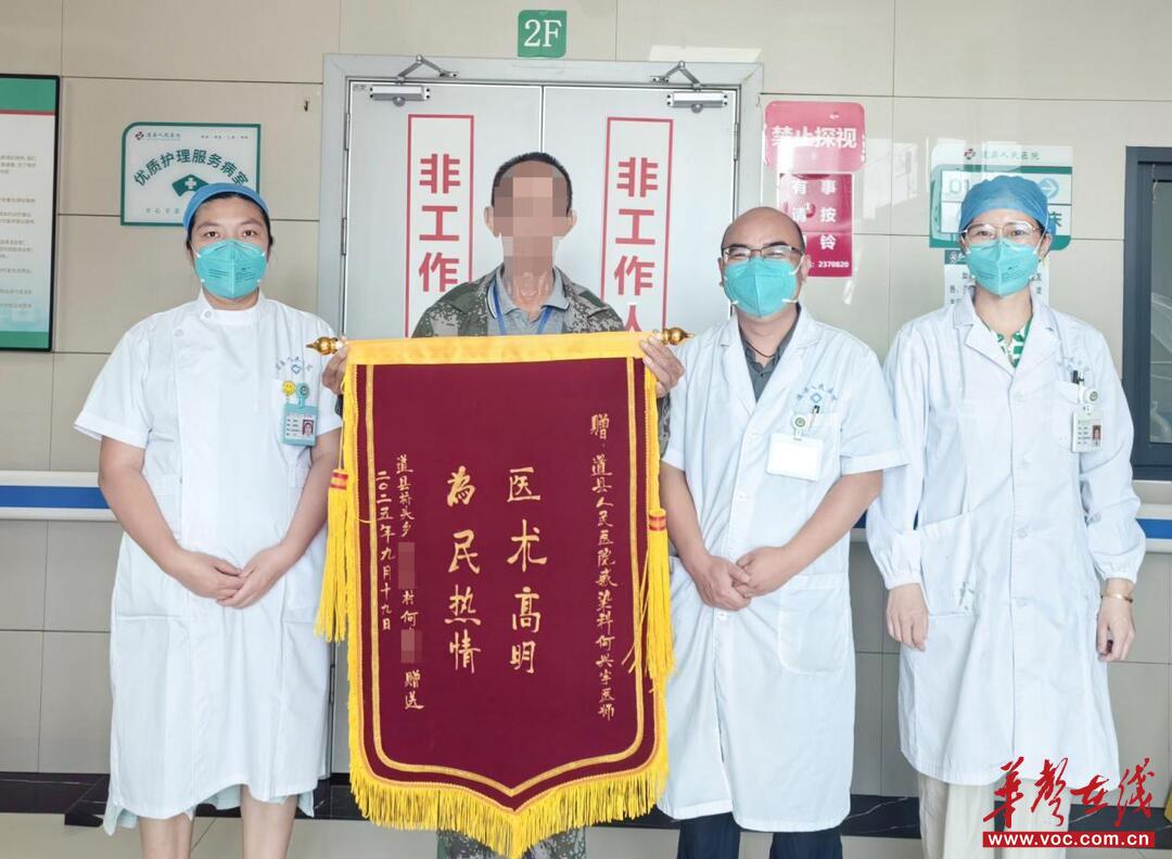 华声在线9月15日讯(通讯员柏华林 黄金玲)“医术高明,为民热情!”9月15日上午,道县人民医院感染科病房外,患者何某某将一面鲜红的锦旗郑重交到医护人员手中,锦旗上金灿灿的8个大字,不仅是对感染科全体医护人员的由衷感谢,更是医院“以人民健康为中心”服务理念的生动缩影。