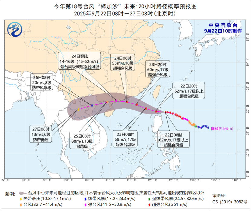 中央气象台9月22日10时继续发布台风黄色预警,预计,“桦加沙”将以每小时20公里左右的速度向偏西方向移动,强度变化不大,穿过巴士海峡后,将于23日凌晨进入南海东北部海面,尔后向西偏北方向移动,并逐渐向广东中西部至海南岛东北部一带沿海靠近,强度稍有减弱。