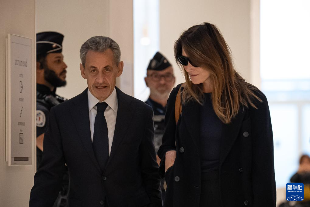 9月25日,法国前总统萨科齐和夫人布吕尼抵达巴黎一家法院。新华社发(奥雷利安·莫里萨尔摄)