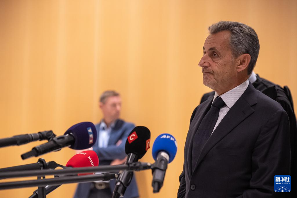 9月25日,在法国巴黎,法国前总统萨科齐在庭审后接受媒体采访。新华社发(奥雷利安·莫里萨尔摄)