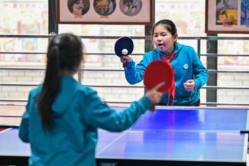 在新疆乌鲁木齐市第一小学,学生在体育课上练习乒乓球。新华社记者 丁磊 摄