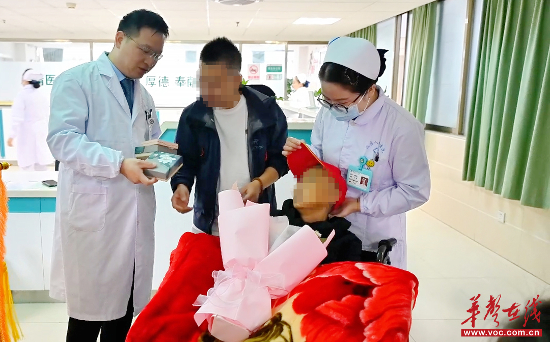 考虑到家属长期在天津生活,家属提出转院方便后续康复照护。道县人民医院主动联系天津环湖医院,协调转院事宜。转院送别这天,神经外科的护士们捧着一束向日葵,护士长还塞给老人一个绣着“平安”的香囊:“奶奶,这是我们自己缝的,您带着它,到了天津好好康复,我们等着您报平安!”老人紧紧攥着香囊,泪水浸湿了眼角。