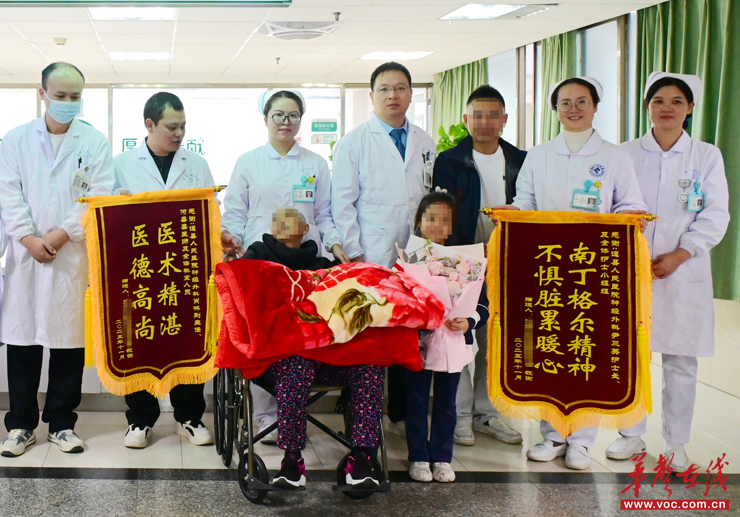 华声在线11月4日讯(通讯员 柏华林 熊昭宇 毛令一)2025年11月3日清晨,湖南道县人民医院神经外科病区暖意融融。72岁的朱奶奶坐在轮椅上,眼神清亮,笑着向医护人员挥手告别。她的儿子双手捧着两面鲜红的锦旗,上面“医术精湛,医德高尚”“南丁格尔精神,不惧脏累暖心”的金色大字,在晨光中格外耀眼。这场始于紧急救治、成于湘津协作、终于温情送别的生命接力,跨越1800公里,让医患之间的信任与温情,在深秋里绽放出最美之花。