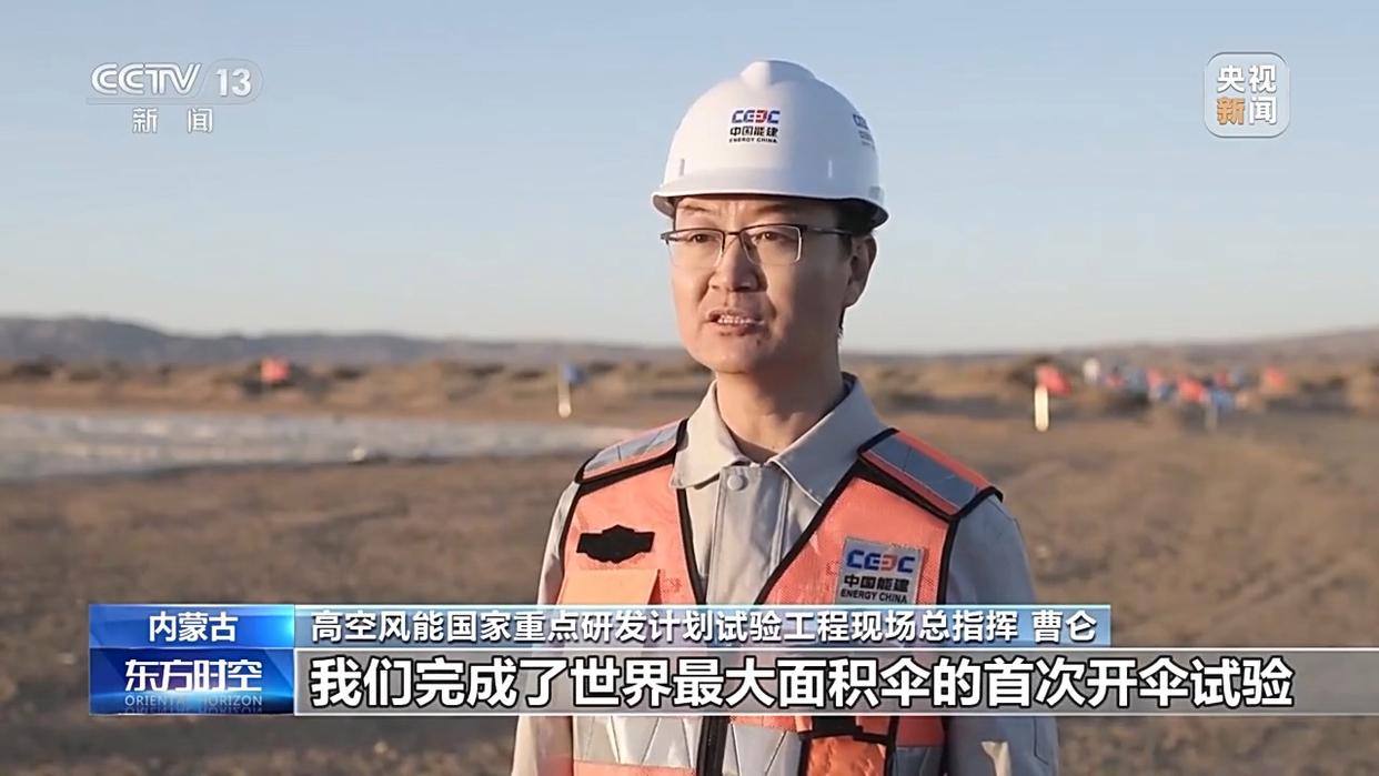 高空风能国家重点研发计划试验工程现场总指挥 曹仑:我们完成了世界最大面积伞的首次开伞试验,成功采集了系列数据,为伞梯设计定型提供了科学依据。每一组数据都是未来成套装备与标准体系的基石。