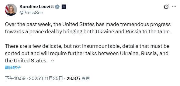 △美国白宫新闻秘书莱维特25日发布声明称:“还有一些棘手但并非不可克服的关键细节亟待解决”。