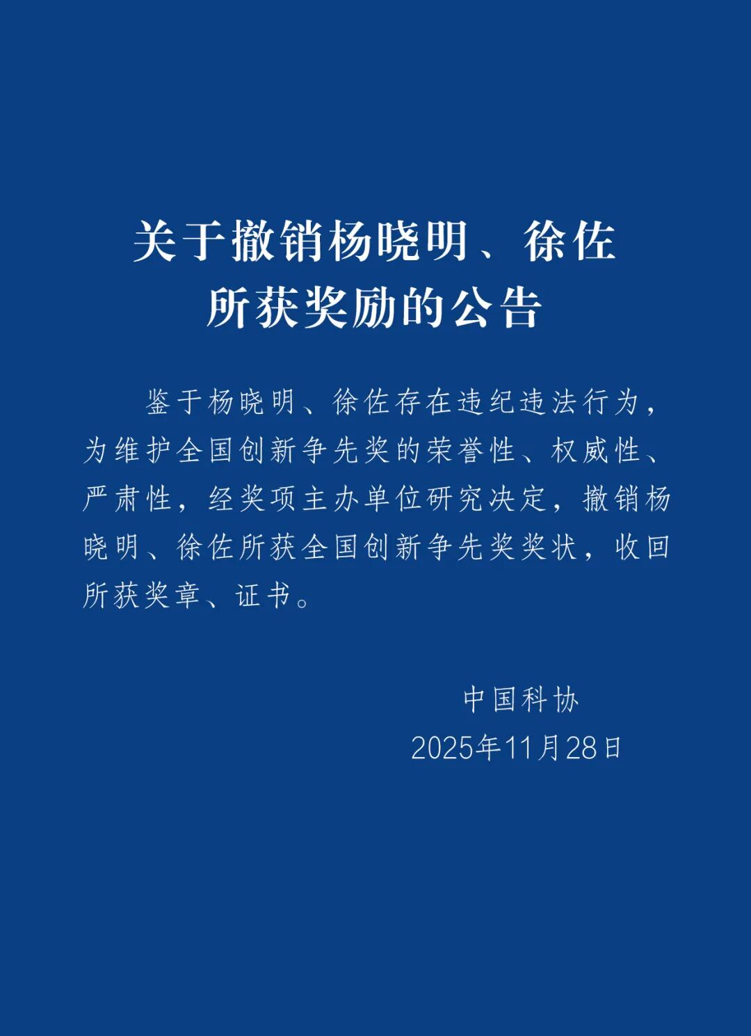 11月28日,中国科协发布关于撤销杨晓明、徐佐所获奖励的公告: