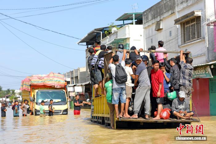 当地时间11月30日,印度尼西亚苏门答腊岛冷吉县丹戎普拉镇,受灾民众乘卡车出行。中新社记者 李志全 摄