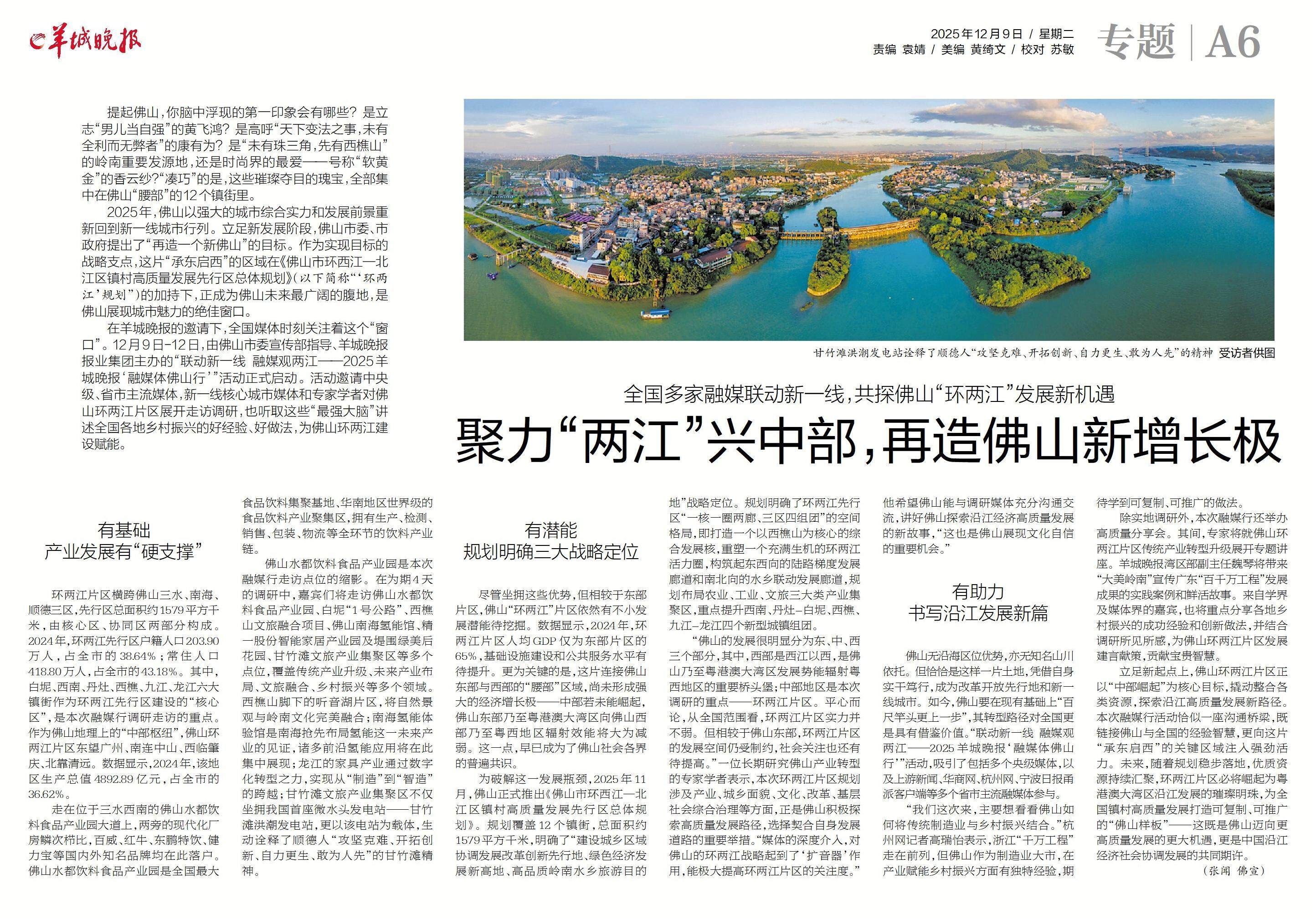 在羊城晚报的邀请下,全国媒体时刻关注着这个“窗口”。12月9日-12日,由佛山市委宣传部指导、羊城晚报报业集团主办的“联动新一线融媒观两江——2025羊城晚报‘融媒体佛山行’”活动正式启动。活动邀请中央级、省市主流媒体,新一线核心城市媒体和专家学者对佛山环两江片区展开走访调研,也听取这些“最强大脑”讲述全国各地乡村振兴的好经验、好做法,为佛山环两江建设赋能。