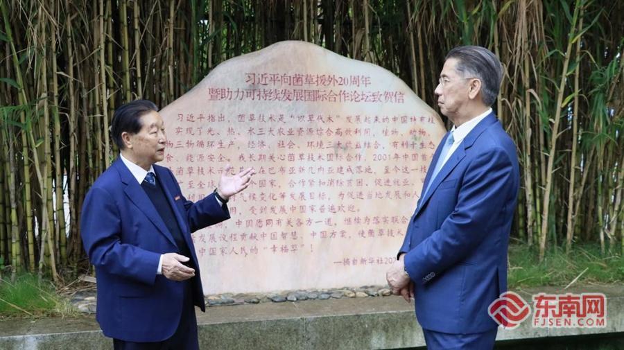林占熺(左)在福州向谢西蒙介绍菌草援外情况。