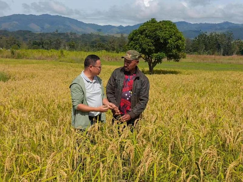 菌草、旱稻技术援外成员林应兴(左)在巴新与当地农业技术人员交流旱稻种植。(受访者供图)