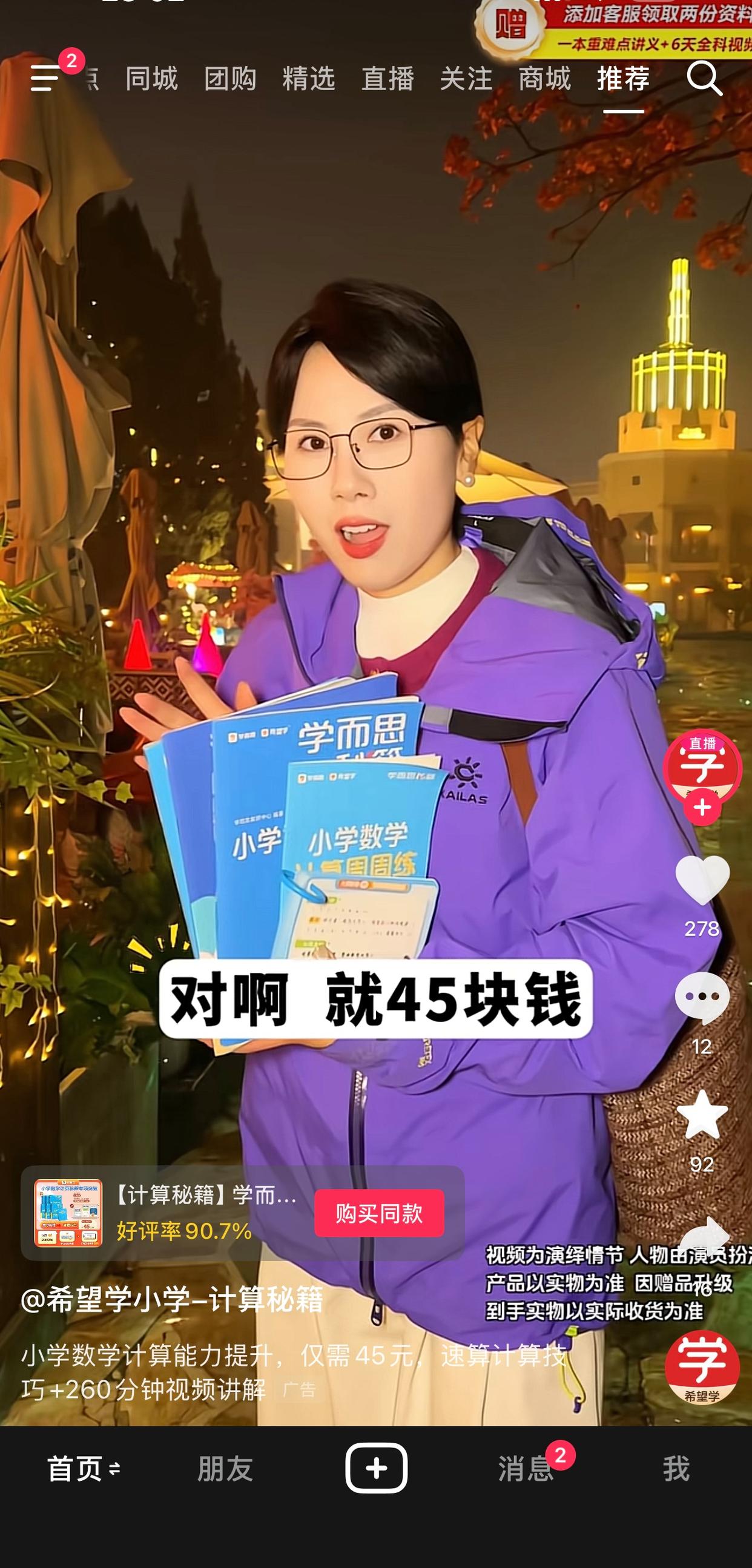 韩女士上周在短视频平台刷到一条“计算秘籍”的推广视频:“小学阶段学好速算,能让孩子受益6年!这本秘籍包含大量速算技巧,搭配同步练习册,孩子每天练15分钟,计算速度提升50%!”视频里展示的彩色印刷例题,韩女士瞧着特别好,想到儿子数学计算能力偏弱,她当即花45元下了单。下单后没多久,她就接到了一通陌生电话:“您好,我是速算秘籍的辅导老师,请您添加专属班主任老师微信。”韩女士添加微信后,对方又发来一个群链接:“咱们秘籍配套了5节免费速算直播课,进群就能领取课程表,都是资深老师授课。”