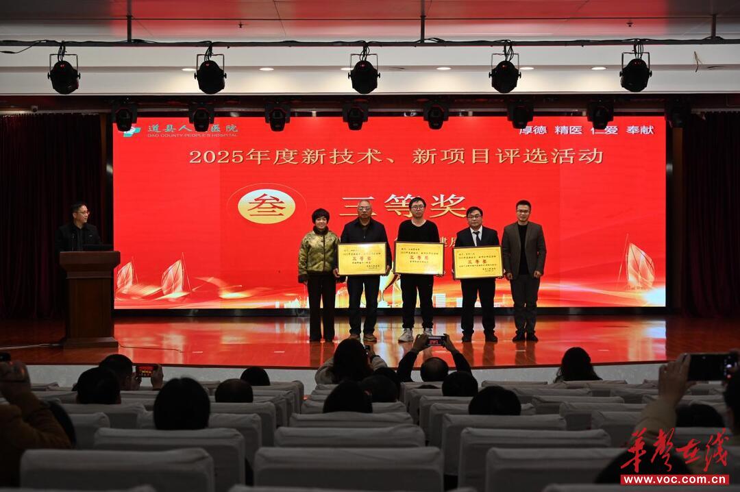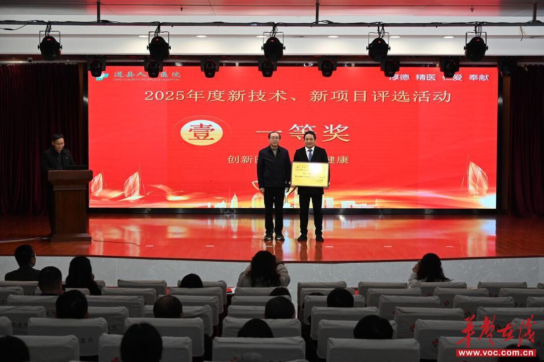 华声在线2月4日讯(通讯员 毛令一 熊昭宇)2月2日下午,道县人民医院门诊4楼多功能会议室内掌声阵阵,气氛庄重而热烈。随着获奖团队依次上台接过荣誉奖牌,道县人民医院2025年新技术新项目评选活动在颁奖仪式中圆满落下帷幕。这不仅是对医院一年来科技创新成果的集中表彰,更是对未来学科发展与技术突破的再次动员。