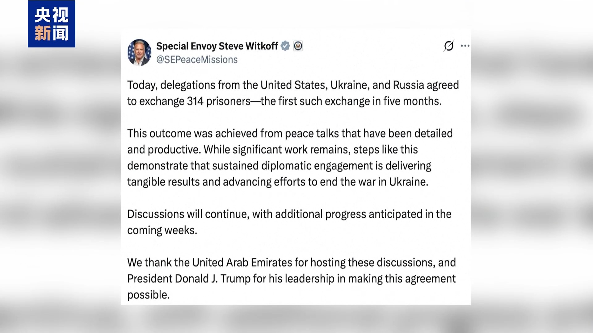 美国总统特使威特科夫5日在社交媒体上发文说,美国、乌克兰和俄罗斯三方代表当天达成协议,俄乌同意交换314名被扣押人员。各方将继续开展对话,预计今后数周将取得更多进展。