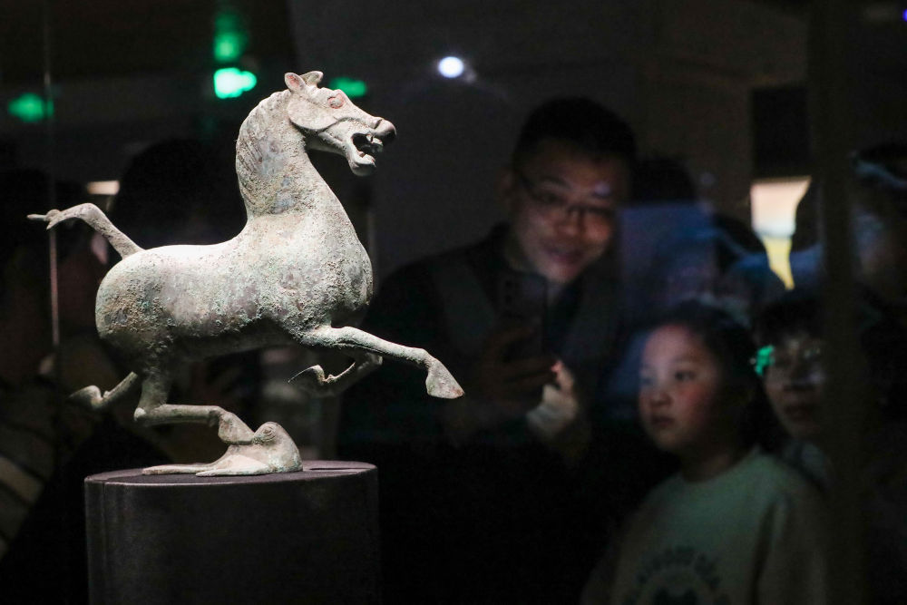 2026年1月26日晚,在甘肃省博物馆二楼丝绸之路文明展厅,观众观看铜奔马(复制品)。新华社记者 郎兵兵 摄新华社兰州2月7日电 题:“马元素”文创产品引领中国春节消费新潮流