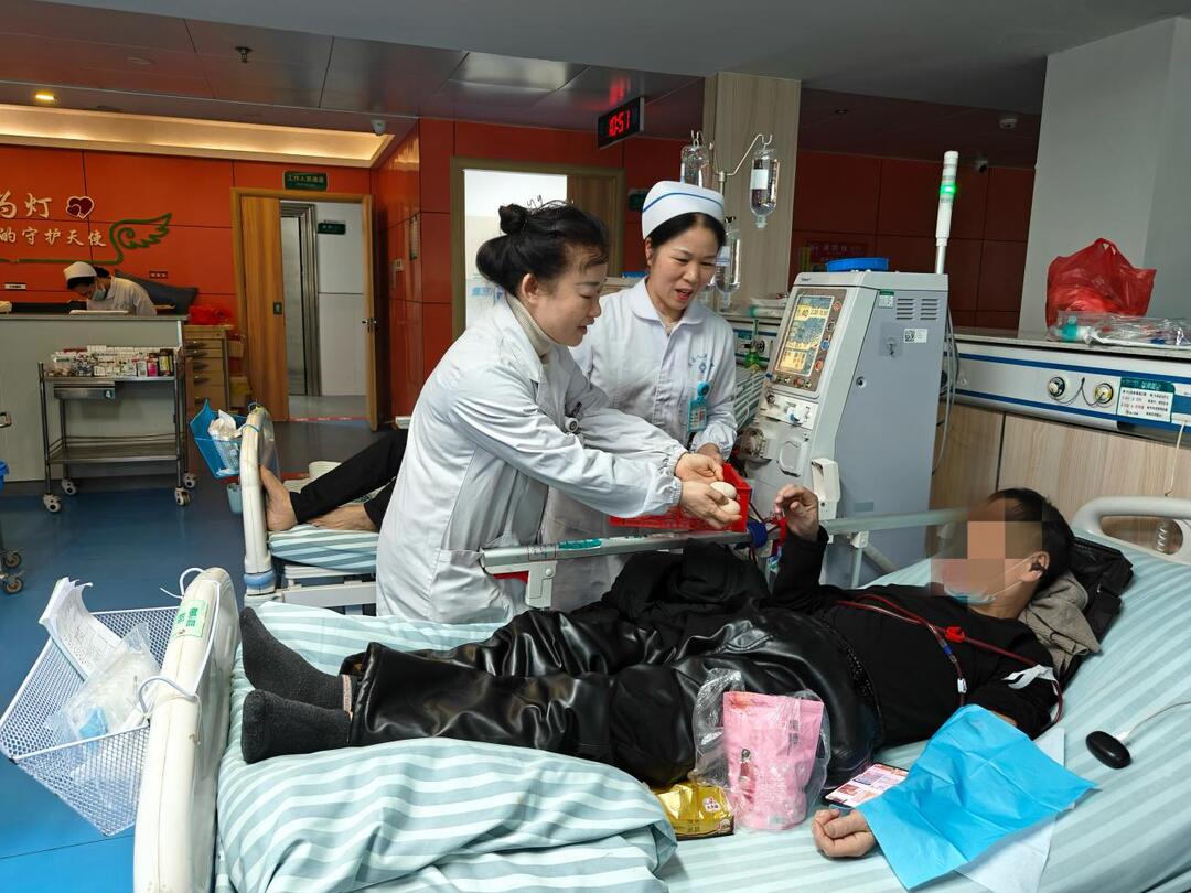 肾内科:精心策划“新春送鸡蛋”活动,为在院治疗的百余名肾友送上一份特别的节日礼物,让肾友们在医院也能感受到浓浓的年味和家的温暖。(成琳 摄)