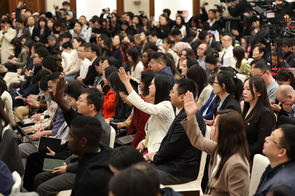 这是记者在发布会上举手提问。